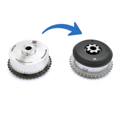 The original BMW variable valve timing gears feature an aluminum gear, which over time tends to flake and deteriorate. The resulting metal shavings accumulate on the oil filter, and in extreme cases, they can enter the oil supply system, leading to accelerated wear of other engine components.